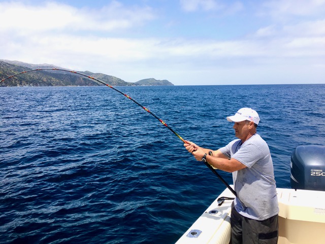 By late morning we had only landed a few keeper calicos and Skipper was debating chasing the radio fish that were supposedly wide open at Eagle Rock on the other side of the west end. We did not want to go there and had several other spots in mind on our constant probe to the west. We then stopped at a very familiar and versatile spot near the Isthmus, where we metered around before selecting a spot for the hook in 60 feet of water that would put our stern above a steep decline and a strong west current. It was a good corridor for calicos and the right structure through which yellows or even a white seabass might flow. There were other spots nearby to try for deeper species and the current was perfect.